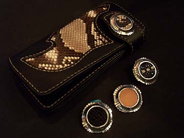 コンチョにヌメ革タン色をいれ、ヌメの経年変化も楽しむも良し、パイソンウォレットに合わせてパイソン革をはめ込むも良し、ウォレットはプレーンでも、コンチョにエイ革を入れるも良し、楽しめるコンチョでもあります。