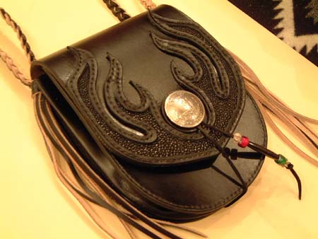 お乗りのハーレーのタンクと同じようにファイヤーパターンを入れ、そこにエイ革をインレイしてほしいとのオーダーでした。