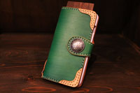 | 手帳型スマートフォンケース。碧色に手染め致しました。スライド金具がついており、カメラ撮影時は上にスライドして使うことができます。 |