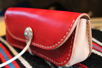 手染めで赤色に染め上げた、メガネケースです。鹿紐で巻き留めるタイプをご希望でした。