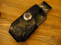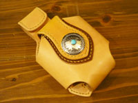 | レザースミスオリジナルコンチョを配置したウォレットホルダー。コヨーテのデザインをトカゲ革でインレイしました。 |