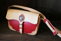 | 女性のお客様からのご注文。ショルダーバッグ。赤色に手染めし、ナチュラルタン色との2トーンでの制作。コンチョも特注です。 |