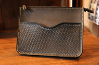 | クラッチバッグのご注文。バスケットスタンプをポケット部分に施しました。ジッパーでの開閉です。 |