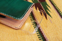 | 手帳型スマートフォンケース。緑色に手染め致しました。スライド金具がついており、カメラ撮影時は上にスライドして使うことができます。 |