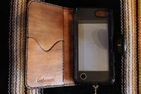 | 手帳型スマートフォンケース。茶色に手染め致しました。スライド金具がついており、カメラ撮影時は上にスライドして使うことができます。 |