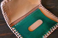 | 緑色に手染めし、縁をダブルレースで編み上げた定期入れになります。 |
