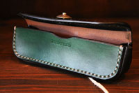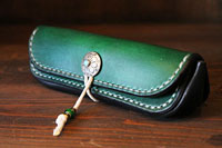 | 手染めで緑色に染め上げた、メガネケースです。鹿紐で巻き留めるタイプをご希望でした。 |