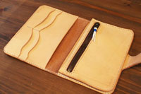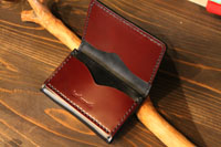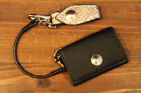 | 収納力を上げたカードケースになります。お札も畳んで収納できるようになっています。良く物を無くす方だそうで、キーホルダーとロープも併せてオーダー頂きました。 |
