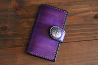 | 手帳型スマートフォンケース。紫色に手染め致しました。スライド金具がついており、カメラ撮影時は上にスライドして使うことができます。 |