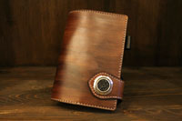 手染めで茶色に染め上げ、レザースミスオリジナルコンチョをセットしています。本体の下部分にフラップがくるようにとのオーダーでした。 |