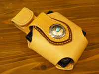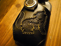 | レザースミスオリジナルコンチョを配置したウォレットホルダー。コヨーテのデザインをトカゲ革でインレイしました。 |