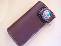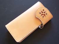 船乗りのお客様からのオーダー。ロングウォレットです。コンチョを使わず、代わりに船乗りさんらしく、コンパスマークを赤いエイ革でインレイしています。 |
