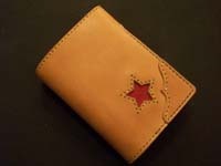 女性のお客様からミドルウォレットのご注文。四隅補強を入れ、ワンポイントに赤いエイ革で星をインレイしています。内部もご希望通りに仕上げました。 |