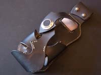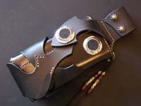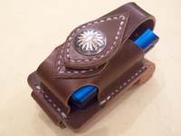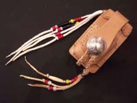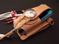 | レザースミスオリジナルのデザインを少し変更し、3つ編みの鹿紐で留める仕様になっています。ハーフダラーコンチョを使用し、ビーズを惜しみも無く使っております。 |