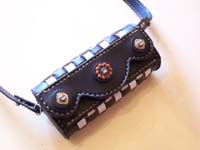 お客様デザイン、アイデアお持込で製作しました。サングラスケースです。本体部分は白いレースを全体に編みこみ、コンチョはズニ族ジュエリーをカスタムし使用しました。 |