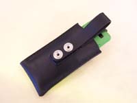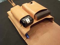 中に文庫本、ボールペン、ハープケース、名刺ケースが納まるようにとのオーダーでした。ランドセルみたいなデザインです。ボタンもレザーで製作しました。 |