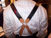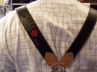 タン、ブラックの2色でサスペンダーをとのオーダー。赤色のスティングレイをインレイしています。お客様とデザインを打ち合わせて取り掛かりました。 |