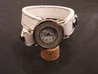 | 2重巻きのウォッチブレスです。ホワイトレザーで製作しました。お子様へのプレザントだそうでスワロフスキースタッズを打ち込んでいます。 |