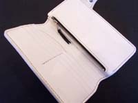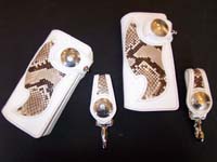 | レザースミスオリジナルパイソンロングウォレットをホワイトレザーで製作。コバも全て白に染めました。キーホルダーも合わせてオーダーしていただき、パイソンをインレイしています。 |