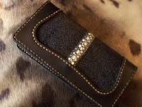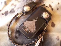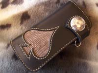 | レザースミス限定のリザード革を使用した、ロングウォレットです。非常に珍しい色のリザードです。スペード型にインレイしています。息子さんへのプレゼントだそうで、羨ましい限りです^^ |