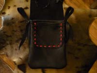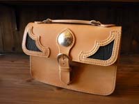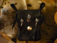 | ナバホ族ハンドメイドドリームキャッチャーペンダントを3個付けた、大鹿メディスンバッグです。開けるとMDウォークマンが収納できるようになっています。ハーフダラーコンチョ使用。 |