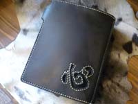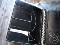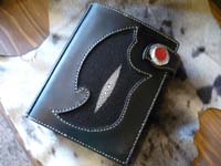 | ウォレットのようなシステム手帳をとのオーダーでした。内部にもウォレットの要素が入っています。単石スティングレイ仕様。「心」という字をインレイしています。これは美容師であるお客様の店名から1字とってデザインに組み入れています。レザースミスオリジナルコンチョ スティングレイを使用。存在感抜群のシステム手帳です。 |