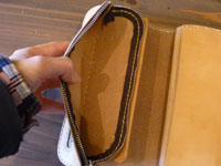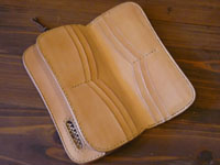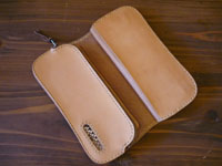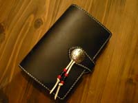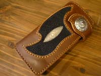 | 横型の携帯ケースです。シンプルにとのご注文で、素材感を押し出したデザインとなりました。アメリカ1セントコンチョ使用。 |