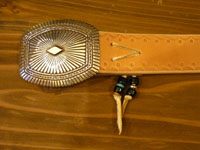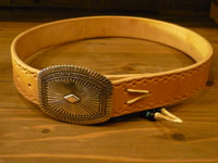 | スタンプワークを施したレザーベルトです。バックルはナバホ族、オービル・ホワイトさんのシルバーバックルを使用。 |
