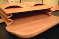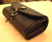 | エイの連石を活かしたメガネケースです。ボディにエイを使用し、ダブルレースで淵を編んでいます。薄いサングラスを別に収納できるようにとのことでしたので中は2層構造になっています。