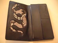 ロングウォレットパイソンインレイ。出来る限り薄く製作致しました。小銭入れは付けず、お札とカード2枚のみを収納できるシンプルなウォレットです。財布内部に蛇革でヘビを表現しています。