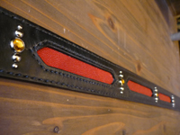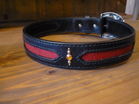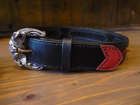| 赤いエイ革とスタッズを組み合わせたベルト。バックルはお持込です。バックルが蛇のデザインだった為、蛇の背骨のイメージでスティングレイをインレイしました。 |
