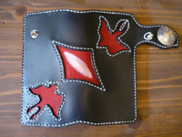 | 赤色スティングレイをインレイしたロングウォレットです。2匹のツバメ(天使と悪魔)が向かい合うデザインで製作しました。存在感のあるウォレットに仕上がりました。 |
