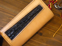 | お客様お持込のカイマンワニのホーンバックをインレイしたウォレットです。 |