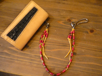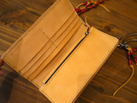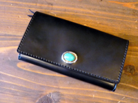 | レザースミスレギュラーアイテム LW-006をセミカスタム。ターコイズコンチョを配し、内装にはバラデザインを赤色でペイント。個性的なウォレットになりました。 |