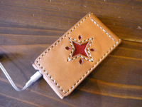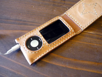 | I POD NANOのケースをご注文。お客様お持込のデザインで製作いたしました。外装にはスティングレイ(エイ革)の赤色をインレイしています。 |