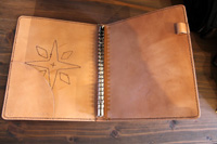 | B5サイズのバインダーのご注文。お客様お気に入りのデザインを入れました。レッドスティングレイですね。内装はシンプルにペン刺し、書類を挟むポケットのみになりました。 |