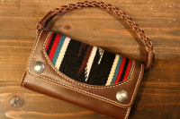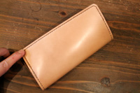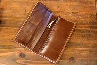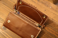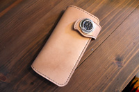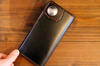 レザースミスオリジナルロングウォレットのデザインをメインに、取っ手を着けられる様にしました。 |