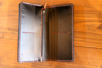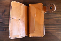 レザースミスでは赤い糸はあまり使用しないのですが、非常にまとまったアクセントのあるウォレットになりました。 |