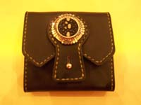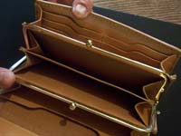 エイ革を羽根の形にインレイしたウォレットです。小銭部にはがま口を使用し、がま口内部にもマチが付いています。 |