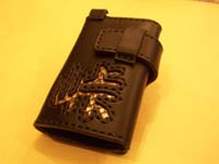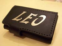 3つ折キーケースに、ご自分のお好きな言葉「峠」と「LEO」をインレイしています。LEOはこれもまたオーダーでシルバーをはめ込んでいます。 |