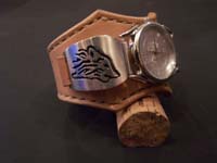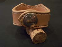 ナバホ族のウォッチバンドをレザーブレスにはめ込みました。裏はドットボタンで留めるようになっています。 |